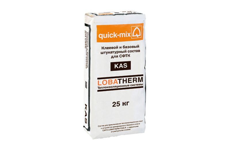 Клеящий и армирующий раствор quick-mix KAS для СФТК используется для фиксации и приклеивания теплоизоляционных плит, для нанесения шпаклевки, армированной сеткой. Водоотталкивающий, высокоадгезионный, устойчивый к погодным условиям и ультрафиолетовому излучению. Для внутренних и наружных работ.